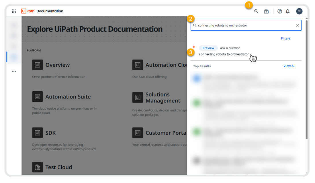 <img src="https://dev-assets.cms.uipath.com/assets/images/automation-cloud/automation-cloud-steps-for-using-the-generative-ai-powered-documentation-search-feature-in-automation-cloud-step-1-illustrates-clicking-the--f8652b63-fbc69649.webp" alt="Steps for using the generative AI-powered documentation search feature in Automation Cloud. Step 1 illustrates clicking the Search button in the documentation section. Step 2 depicts entering a query, such as "connecting robot to Orchestrator", into the search bar. Step 3 shows clicking the Ask a Question button to generate an answer." width="760" />