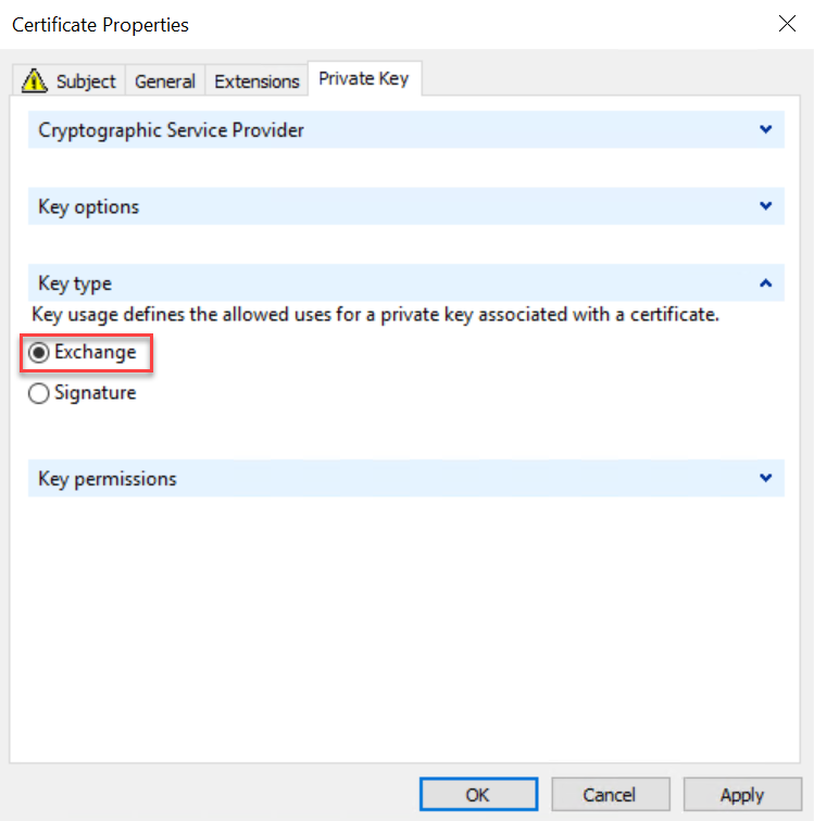 7.3. In the Key type section, make sure Key usage is set to Exchange.